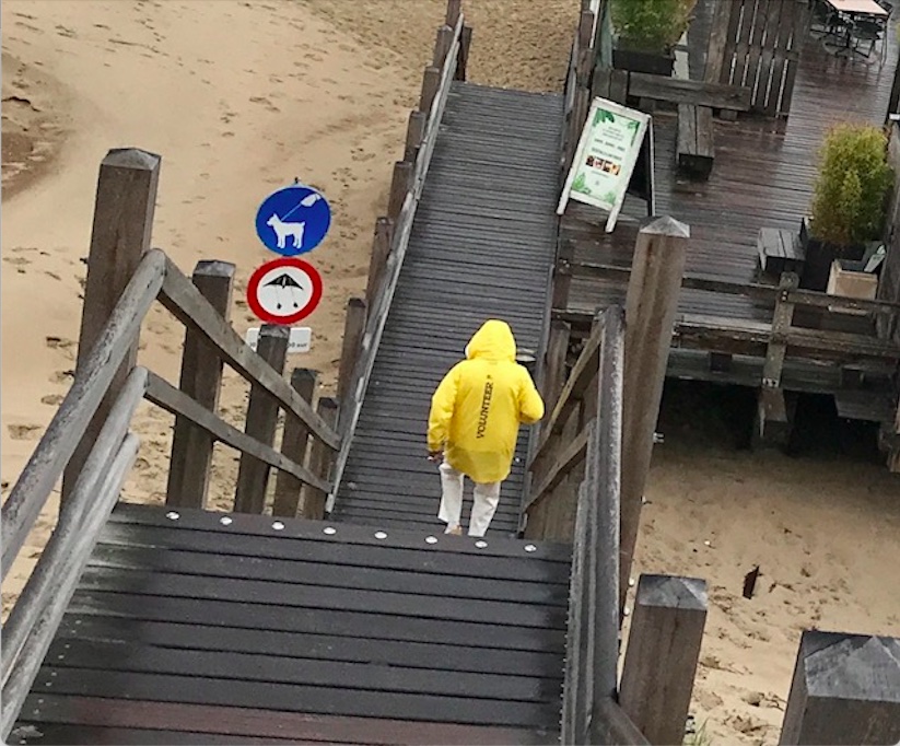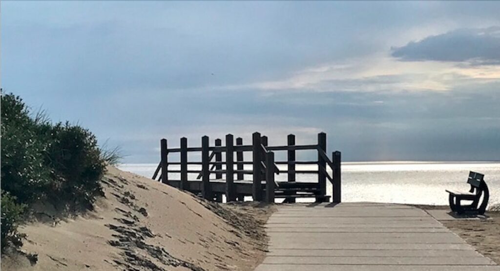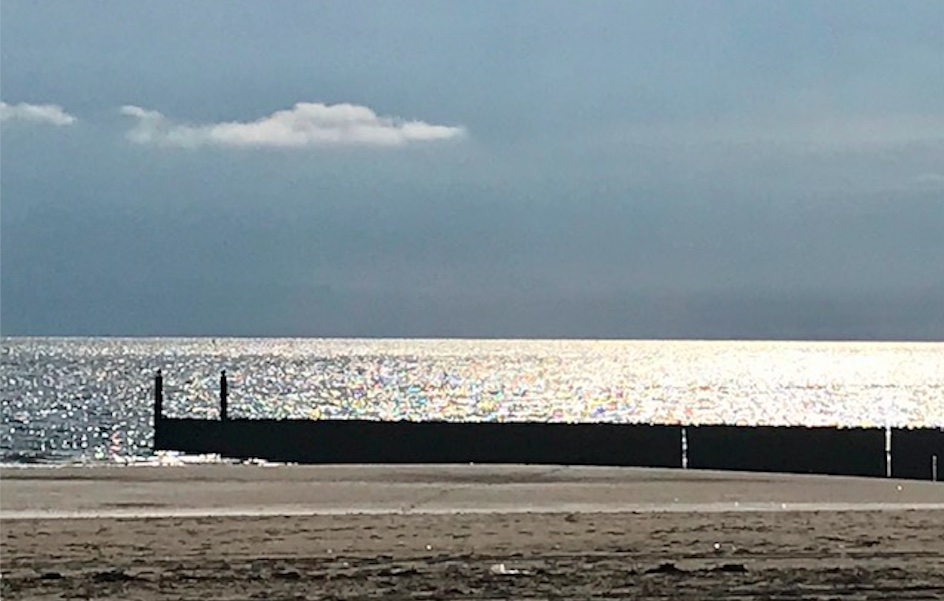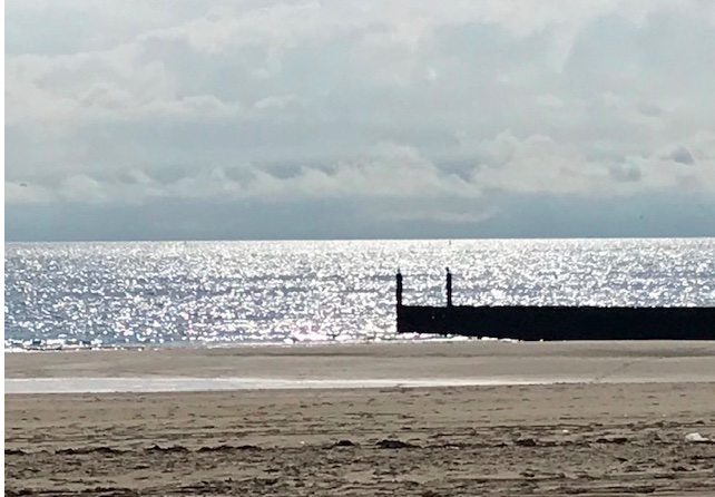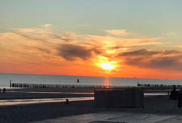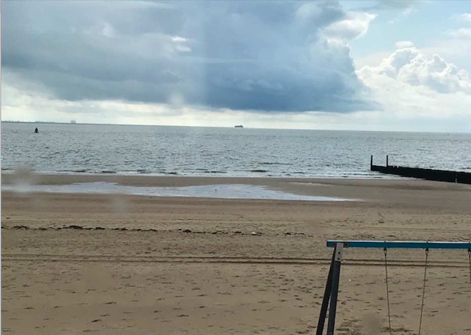 Nach der Ankunft in Dishoek parken wir bei unserem örtlichen Shop und wandern zum Strandpavillon VLOED mit erstem, vertrautem Seeblick über die Sheldemündung und die verschiedenen Fahrrinnen der Schiffe in der Nordsee …