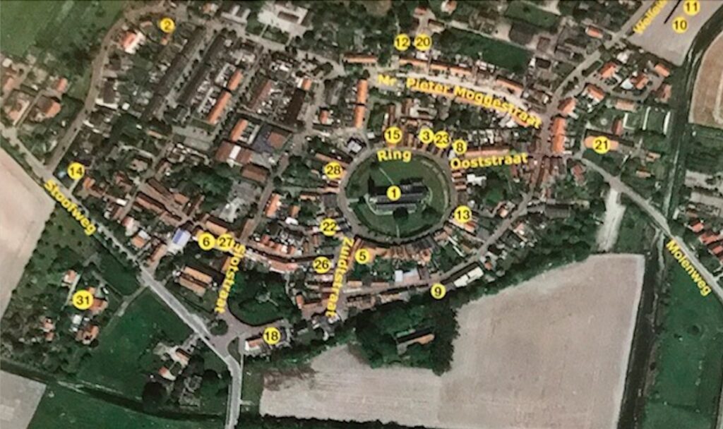 In der Dorfmitte steht die zweischiffige, restaurierte Sint Adrianuskerk, die eine der schönsten Grabkapellen der Niederlande aufweist. Ihr Turm sank schon während des Baues, im 15. Jahrhundert, ab. Die Erbauer korrigierten dies, aber der Turm wirkt noch heute etwas krumm. Am Ring stehen historische Gebäude. Das ehemalige Rathaus mit seinem Treppengiebel stammt von 1637. Ein Beschlag- oder Zwangsstand, zum Beschlagen der Pferde, steht vor der ehemaligen Schmiede.
